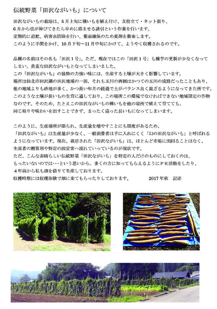 雪国に移住してから始めた畑仕事や伝統野菜の長芋栽培法など、 素人の私が奮闘し成長していく記録動画を紹介する Youtubeチャンネル開設してスタートしました。 今後とも畑作業の記録動画などいろいろ紹介していきますので、 チャンネル登録よろしくお願いします。 田沢ながいもの栽培記録や収穫体験の情報などを 掲載するFBページを作りました。ご覧ください♪ ⇒伝統野菜「田沢ながいも」奮闘記FBページ |
