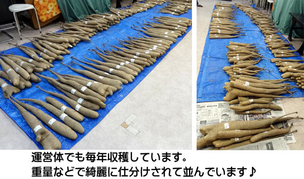 田沢ながいもの栽培は、5月上旬に種いもを植え付け、支柱立て・ネット張り、 6月から弦が伸びてきたら早めに絡ませる誘引という作業を行います。 定期的に追肥、病害虫防除を行い、8月中~下旬には葉面確保のため薬剤を散布します。 このように手間をかけ、10月下旬~11月初旬に、ようやく収穫されるのです。 品種の名前はその名も「田沢1号」。 ただ、現在はこの「田沢1号」も種芋の更新が少なくなってしまい、 貴重な田沢ながいもとなってしまいました。 この「田沢ながいも」独特の力強い味には、生産する土壌が大きく影響しています。 田沢地域、それも玉川の西側はかつての玉川の流路だったこともあり、他の地域よりも砂地が多く、 かつ長い年月の経過で土がバランス良く混ざるようになりました。 そんな地元の土壌が、ながいもの生育に適しており、 この環境でなければ同じ味わいを出すことは困難といわれます。 このように、生産場所が限られるため、「田沢ながいも」は生産量も少なく、 一般消費者は手に入れにくく「幻の田沢ながいも」と呼ばれるようになっています。 |