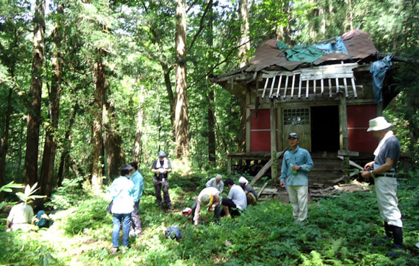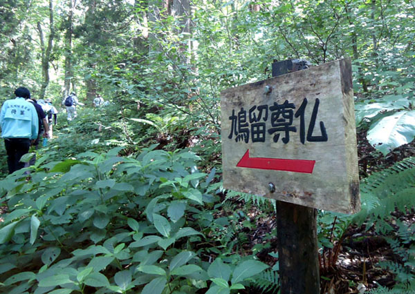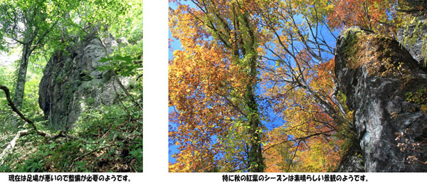 鎧畑ダム、秋扇湖のほとりにあるのが田沢のパワースポットのメインとも言える「お諸仏様」探索へ。 国道341号線から「鳩峰神社」の入り口の看板を目印に右に入り、車で林道を登っていくと、 ほどなく「寝仏・亀石」の看板を見ることが出来ます。 ![]() ![]() お諸仏様を見る前にこの看板の方へちょっと寄り道すると、見事な仏の寝姿の岩があります。 昔は屋根がかけられ、ここで枕をあげてお願いすると頭が良くなるということで信仰を集めたんだそうです。 今でも小さな祭壇が当時をしのばせます。そこから少し藪を通ると「亀石」があります。 こちらはちょっとユーモラスな亀の姿をした岩で、その下の丸い石は卵と言われています。 ![]() 林道に戻り、さらに登ると「鳩峰神社」の看板が見つかります。 ここからは車を降りて徒歩、10分ちょっと歩くとすぐに見えてくるのが鳩峰神社です。 この神社から少し下ると見事なわき水があり、ちょっとした休憩ポイントになっています。 ![]() この先は本当の「登山」、神社の裏から緩急のある山肌を登っていきます。 ゆっくり登って約一時間弱といった行程になります。 途中、お諸仏様を表す「鳩留尊仏(くるそんぶつ)」の看板もありますが、 基本的に案内の方がいないと大変なルートです。 ![]() 「お諸仏様」と呼ばれる巨岩群は、山を登りきった時に突然目の前に広がるのでその迫力は十分。 数mから大きいものでは30mほどの岩々がまるで壁のように並んでいる姿は圧巻です。 ![]() ![]() 確かにこれは、宗教的な意味を見出すに十分なスケールをもった岩たちといえます。 入り口には「門石」と呼ばれる岩が二つ並び、そこからお諸仏様たちに近づくことができます。 間近で見る岩たちはまさに圧巻。見上げるばかりの巨岩が立ち並び、無言のパワーを放っています。 それぞれ仏様の名前がつけられていますが、中にはモアイ像そっくりなものなんかもあります。 秋の紅葉の時期には、虫もおらず、岩と木々との鮮やかなコントラストを楽しむこともできます。 探索体験実施日 2012年8月下旬 |